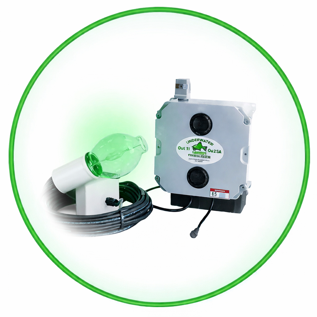 The Super Mega Brite Underwater Green Fishing Light System delivers superior fish-attracting performance with advanced green fishing lights technology. This 400 watt, premium green submersible fishing light creates an irresistible underwater green light beacon that draws baitfish and game fish to your location. Our underwater systems include a dusk to dawn photocell timer. Seeing the fish for pleasure or sport has never been easier and more fun!Upgrade your underwater green fishing light system with our custom "Lazy Boy Wifi Timer" and/or a protective cage.